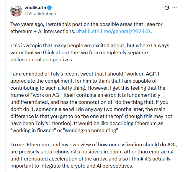 以太坊联合创始人Vitalik Buterin近期阐述了以太坊与人工智能交汇的新愿景,认为两者可协同提升市场效率、金融安全与人类能动性。
