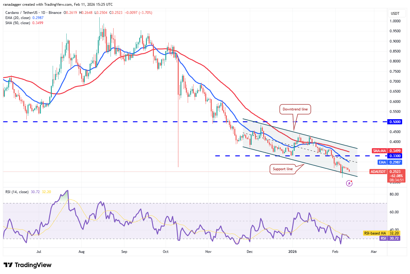 卡尔达诺(ADA)正逐渐滑向下降通道模式的支撑线,表明空头持续施压。
