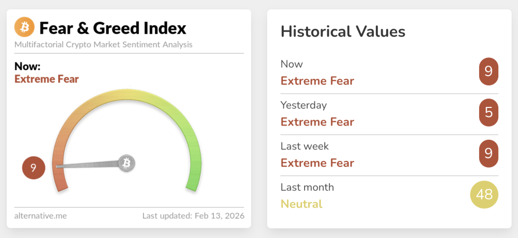 衡量整体加密市场情绪的加密货币恐惧与贪婪指数,今年大部分时间停留在“恐惧”和“极度恐惧”区间。周五该指数显示“极度恐惧”读数为9,表明市场参与者对投入资金仍高度谨慎。