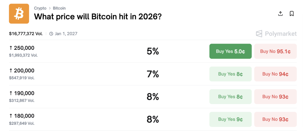 对比特币超级多头不利的是,专家们对BTC在2026年达到25万美元的可能性持高度怀疑态度(Polymarket数据)