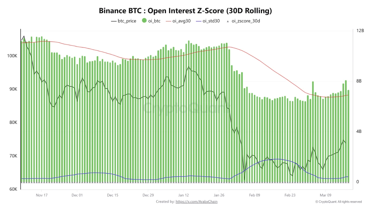 CryptoQuant追踪的币安比特币未平仓合约30日滚动Z值显示,其30日移动平均已回落至约69.1亿美元,创下自2024年10月以来的最低纪录。当前总未平仓合约规模为73.3亿美元,链上分析师ArabxChain指出,当前市场正处于“重新布局阶段”,尚未出现明确的趋势性反转信号。