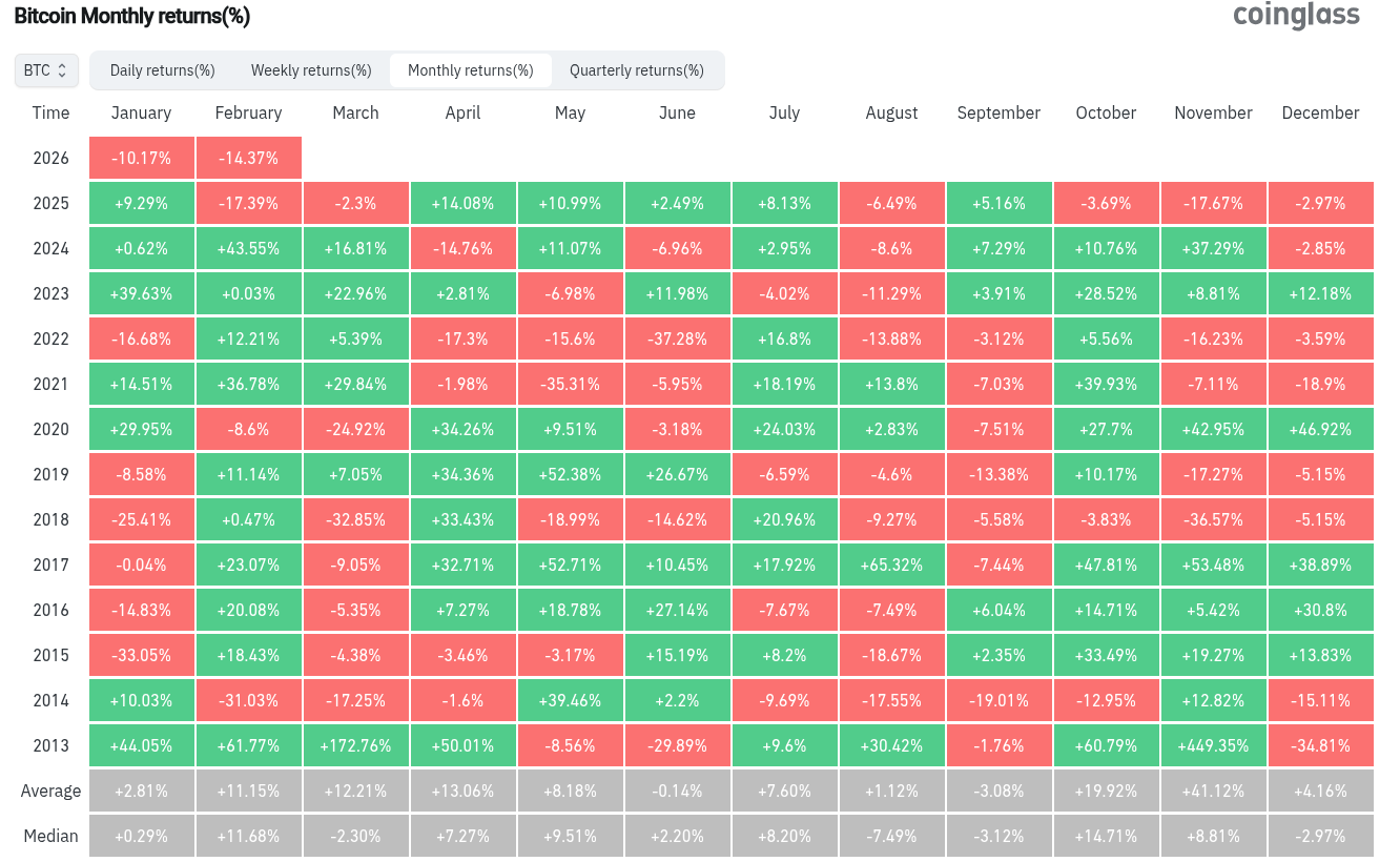 来自监测资源CoinGlass的数据显示,比特币在2026年2月的跌幅为-14.4%,几乎与去年的表现持平。然而,自2013年以来,2月份仅出现过三次收跌的情况。