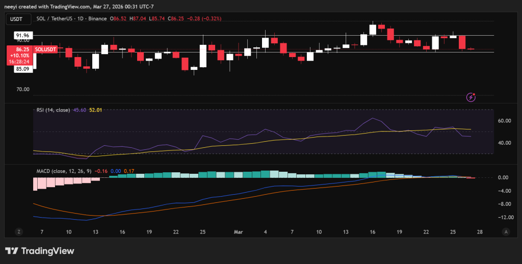 Solana(SOL)在24小时内下跌约3%,现价约为86美元,日内交易区间为85美元至93美元。这一表现使其成为当前阶段大型加密资产中相对弱势的标的之一。