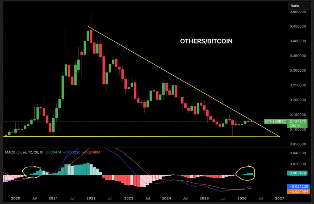 历史回测表明,此类形态出现后三个月内,山寨币平均涨幅达60%。目前OTHERS/BTC比值接近0.127,且动能指标已进入正向区间,进一步印证上行压力正在积累。