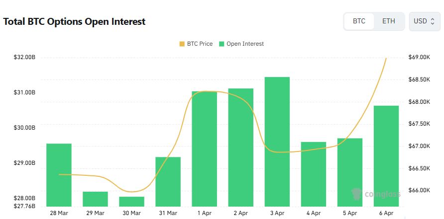 24小时交易量最高的合约分别为:38万美元看涨期权(6月26日·Deribit)、6.7万美元看跌期权(4月24日·Deribit)、6.85万美元看涨期权(4月6日·Bybit),表明近期市场对特定行权价与到期日的博弈尤为激烈。