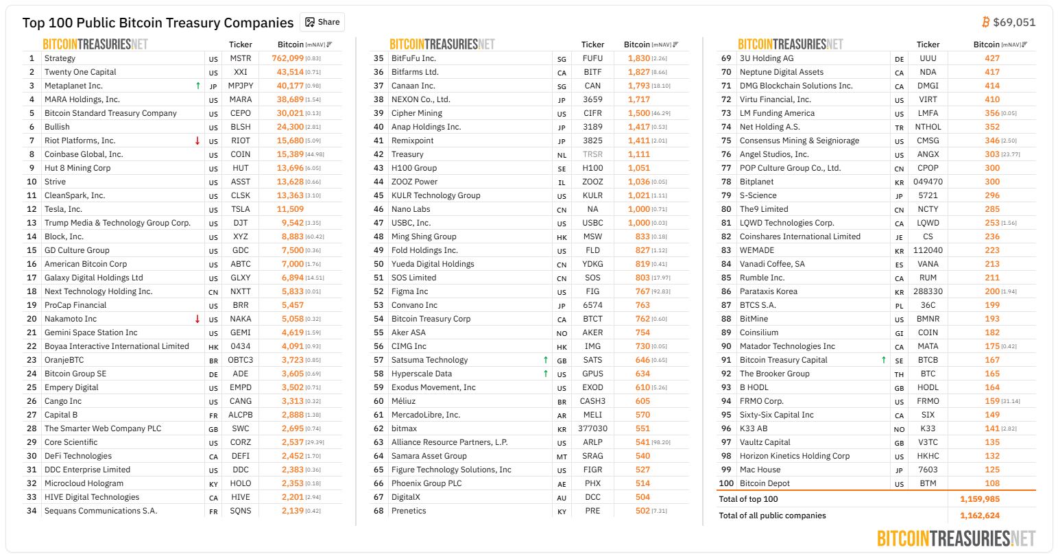 私营企业合计持有28万7942枚BTC,约合198亿2900万美元,占比1.371%。其中,Ionic Digital持有2662枚,Zap Solutions为1500枚,GIGA Inc达1252枚,Melanion Digital持有342枚,Stake&Shake则为162枚,分别位列第六至第十位。