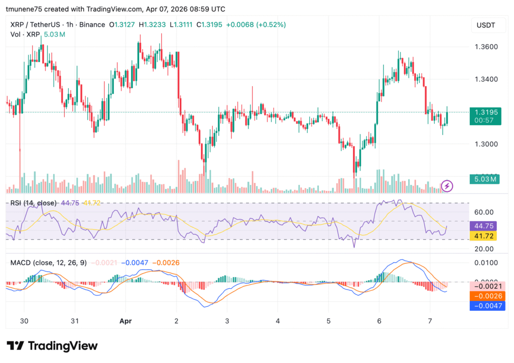 自4月初经历一轮剧烈抛售后,XRP价格在1.33美元区间展开横盘整理。技术层面,1.34至1.35美元构成强阻力区,而1.30美元则成为买方支撑带。相对强弱指数(RSI)接近44,处于中性偏弱区域;MACD指标仍位于零轴下方,维持空头主导结构。