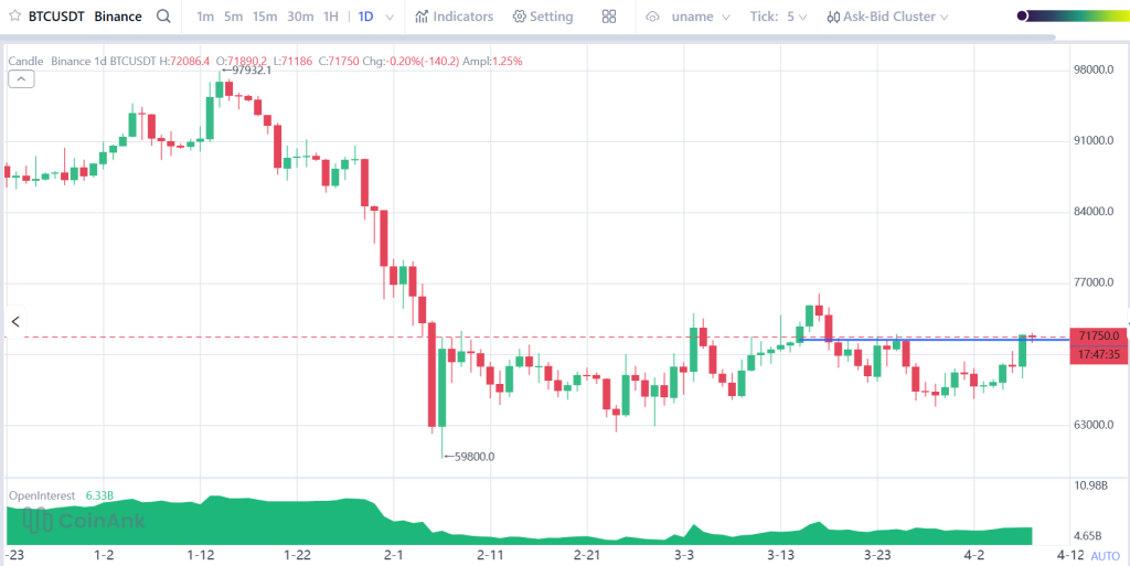 从技术图表观察,比特币正逐步夺回7.2万美元附近的整数关口,该位置此前在上涨过程中形成重要支撑,如今收复失地意味着买方力量正在积聚。当前价格形态显示,市场多头情绪正逐步回归,形成阶段性底部确认。