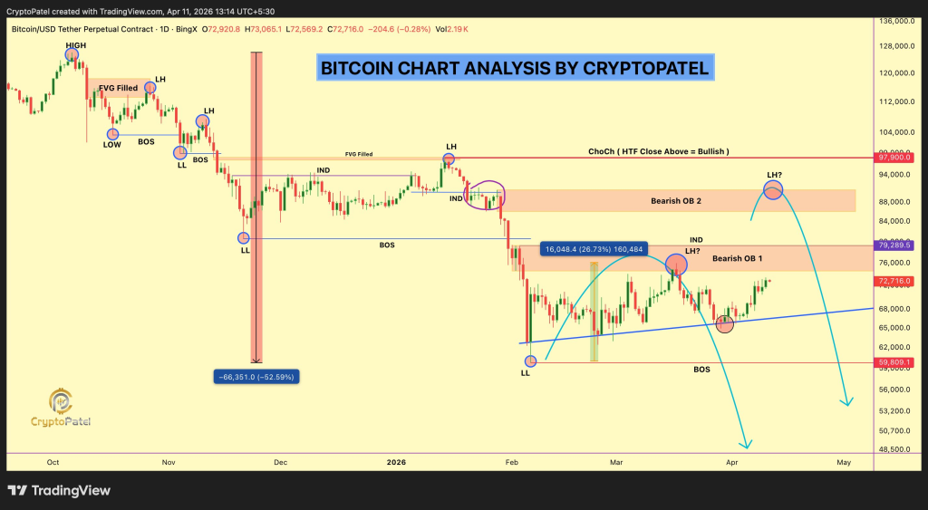 当前比特币价格稳定于73000美元下方的狭窄区间内,看似平静的波动实则释放出强烈的方向性预警。来自Crypto Patel的最新技术图示显示,BTC正处于一个可能重塑下一阶段行情的关键阻力区下方。