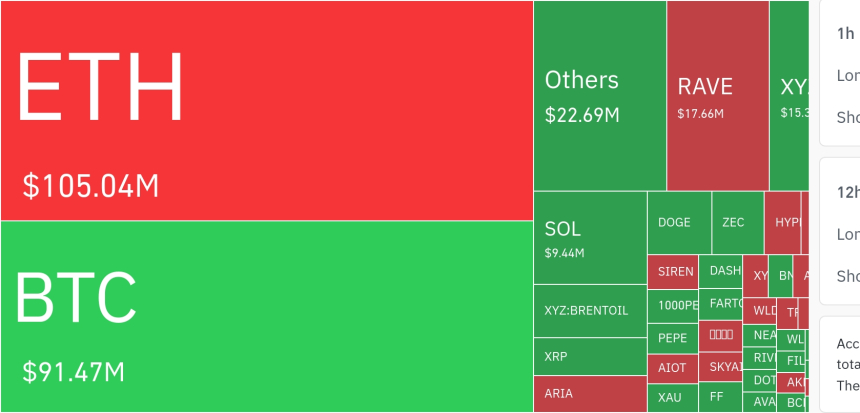 数据显示,本次清算中空头头寸规模约为1.298亿美元,占总清算额的59.12%;多头方向则为8951万美元,占比40.88%,表明市场下行压力下,做空力量率先遭遇强平。
