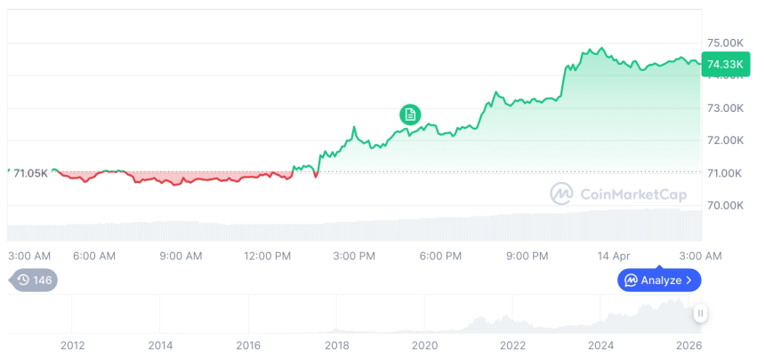 加密货币市场整体呈现强劲上涨态势。根据最新数据,截至4月14日下午12时4分59秒(韩国标准时间),比特币交易价格达到74,365.78美元(约合1.108亿韩元),较前一日上涨4.65%。以太坊价格为2,368.43美元(约合352万韩元),实现7.95%的显著增长。