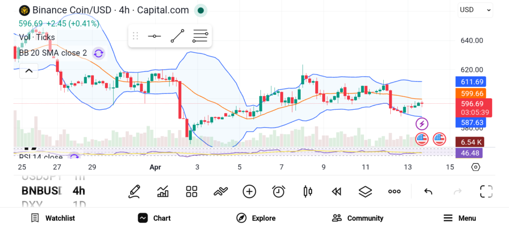 BNB价格在稳固的区间内反复拉锯,多空力量维持动态平衡,近期未出现明显方向性突破。低成交量限制了波动幅度,反映出市场观望氛围浓厚。然而,卖盘压力逐步减弱,下跌动能趋于衰竭,买方信心正在缓慢恢复。