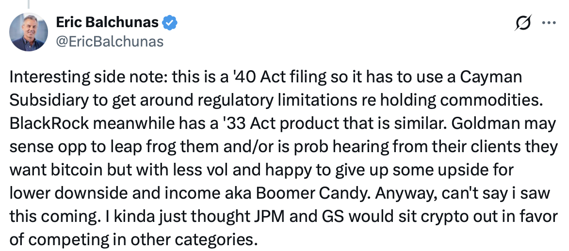 高盛已向美国证券交易委员会提交文件,拟推出一款与比特币挂钩的交易所交易基金,目标是在控制价格波动影响的同时实现持续收益。根据4月14日披露的初步招股说明书,该产品将不直接持有比特币,而是通过配置比特币现货交易所交易产品及关联期权来获取资本增值与现金流。