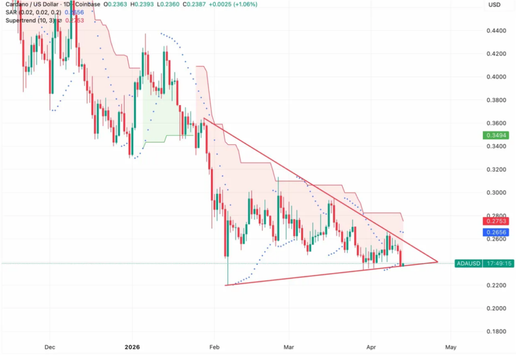 ADA交易活动聚焦于楔形顶部区域,当前价位位于0.2387美元附近,处于0.230美元支撑与0.245美元阻力之间的压缩状态,市场即将迎来关键方向抉择。