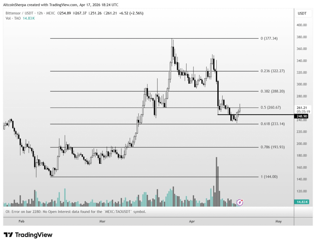 TAO自243美元低点持续回升,显示出明显的买方介入迹象。根据Altcoin Sherpa的技术分析,12小时图中0.618斐波那契回撤位构成有效反应点,该位置常被视为趋势反转的重要观察窗口。若多头能持续发力,下一目标或指向300美元区域。