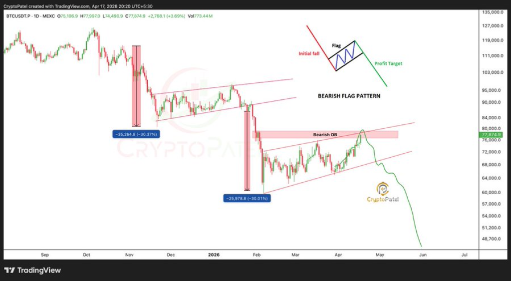 Crypto Patel提出两种可能路径,当前情境下第一条更为可信。若阻力持续压制,价格或下探至68,000美元区域。该目标位与看跌旗形的理论测算值高度重合,具备技术依据。