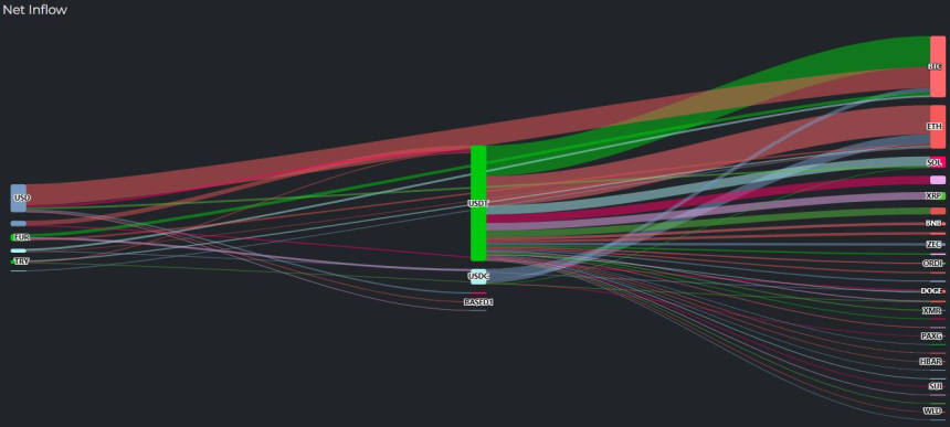 其中,泰达币累计吸纳5639万美元资金,同时美元币(USD Coin)有754万美元资金流出,分别被分配至多种数字资产。比特币获得约2981万美元净流入,以太坊录得2124万美元,Solana与XRP分别吸纳578万和369万美元。