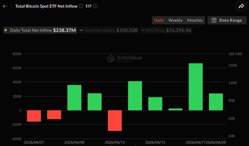 最新数据显示,截至4月20日(当地时间),美国比特币现货ETF市场单日净流入达2亿3837万美元,已连续五个交易日维持资金净流入状态,反映出投资者对数字资产配置的持续偏好。累计净流入金额攀升至579亿8000万美元,市场信心稳步增强。