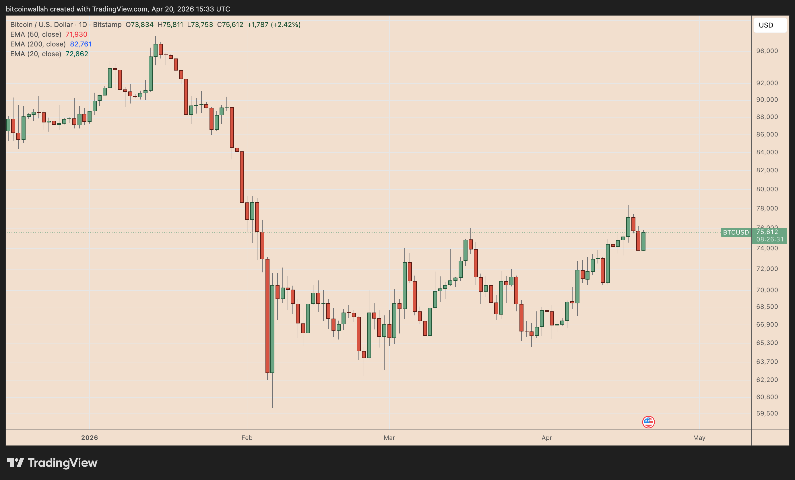 当前比特币价格呈现典型的旗形整理形态,走势正逼近形态下沿。一旦关键支撑位被击穿,4月内或面临向67,000至69,000美元区域回撤的风险。