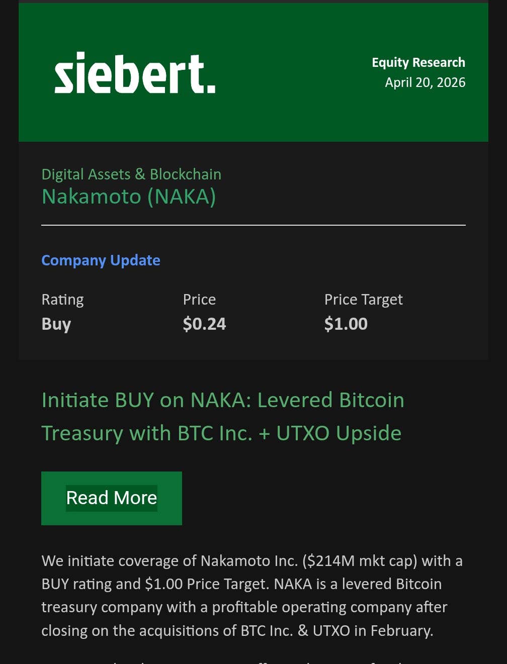 西伯特金融于2026年4月20日发布首份针对中本公司的覆盖报告,给予“买入”评级,并设定1美元目标价,对应当时约0.24美元股价存在近四倍增长潜力。