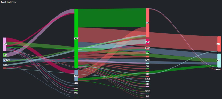 稳定币领域呈现双向流动特征:泰达币在短暂积累约200万美元后,随即流出295万美元,其中大部分被转换为韩元;而USD Coin则实现约818万美元的净流入,比特币亦有280万美元的净流入表现。