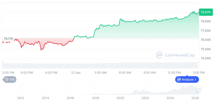 截至2026年4月23日凌晨0时4分,比特币价格攀升至79,072.72美元,较前一日上涨4.47%;以太坊同步上扬4.53%,报收于2,404.53美元,两大核心资产均实现显著反弹。