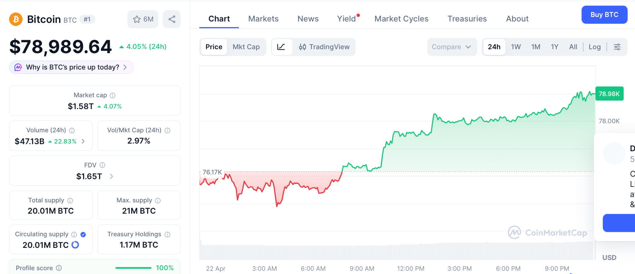 CoinMarketCap数据显示,比特币在4月21日实现2.7%的日涨幅,价格升至78,898美元。