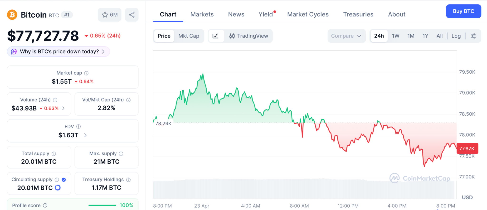 根据最新数据,比特币在4月23日交易于77,727美元,距离2025年10月创下的126,021美元历史高点仍有约38%的差距。短期支撑位位于75,000美元,阻力区间为80,000美元。若停火协议维持至5月,分析师预期目标区间将拓展至80,000至85,000美元。