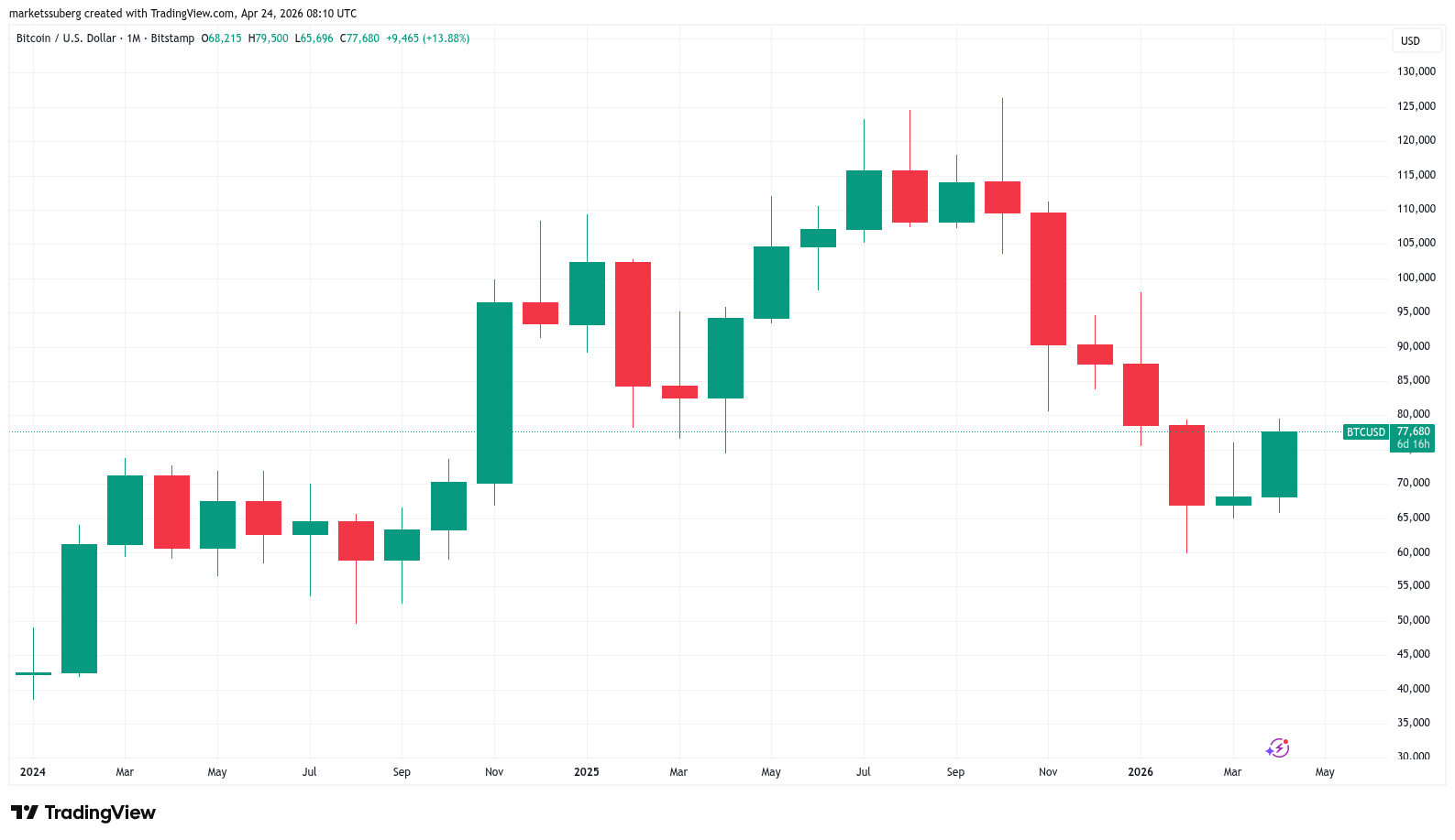 “整个四月维持上行趋势,但即将触及多个高时间框架的关键位,”交易员Daan Crypto Trades指出,“唯有站稳80,000美元上方,方能在更高周期扭转看跌结构。”