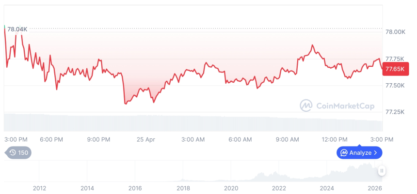 截至基准时间,比特币报价为77,658.61美元,较前一日下跌0.51%;以太坊则录得2,316.39美元,实现0.09%的轻微增长。