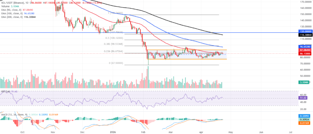 经过连续三个交易日的稳步攀升,Solana在周四收报86.13美元,正逐步逼近87美元附近的核心技术关口。当前价格仍处于平行通道内部波动,体现为有节制但持续的上行结构。该形态暗示市场在积蓄能量,等待方向性突破。