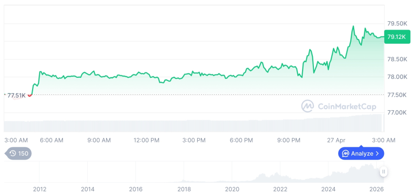 截至4月27日中午12时4分55秒,比特币报价达79,164.54美元,较前一日上涨2.14%;以太坊升至2,393.83美元,涨幅为3.39%。其余主要竞争币种普遍录得正向波动,整体市场呈现显著回升态势。