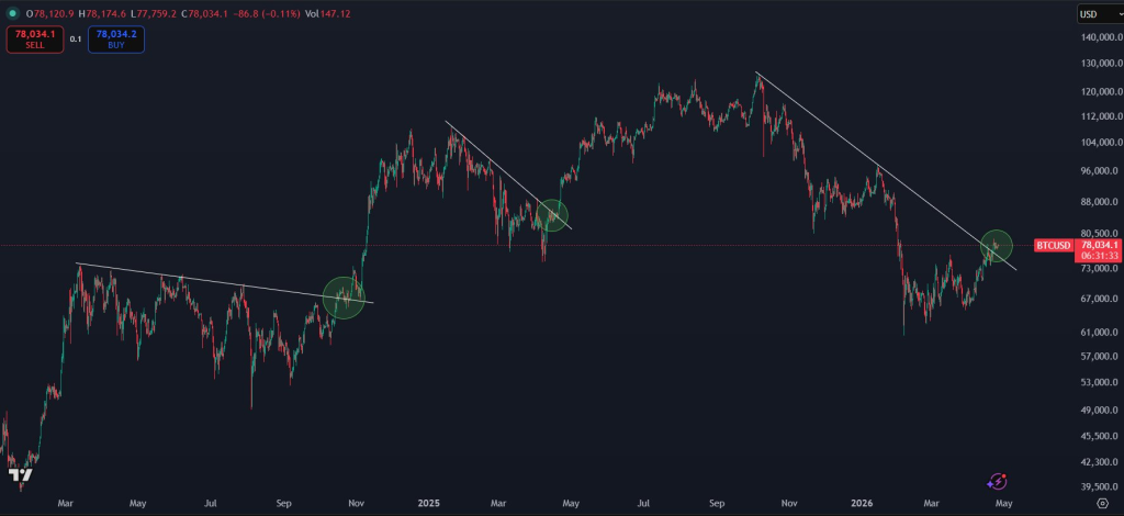 分析师KALEO通过图表揭示其看涨逻辑:当前比特币可能已构筑阶段性底部,近期形成的突破—回测结构与历史上的关键转折点高度相似。图中显示,价格位于78000美元附近,已突破前期下降趋势线,目前在73000至80500美元区间进行回测。若该区域能成功守住,将强化看涨信号,意味着下跌趋势终结,买方主导格局确立。反之,若跌破则可能打开下行空间至67000至61000美元区间。
