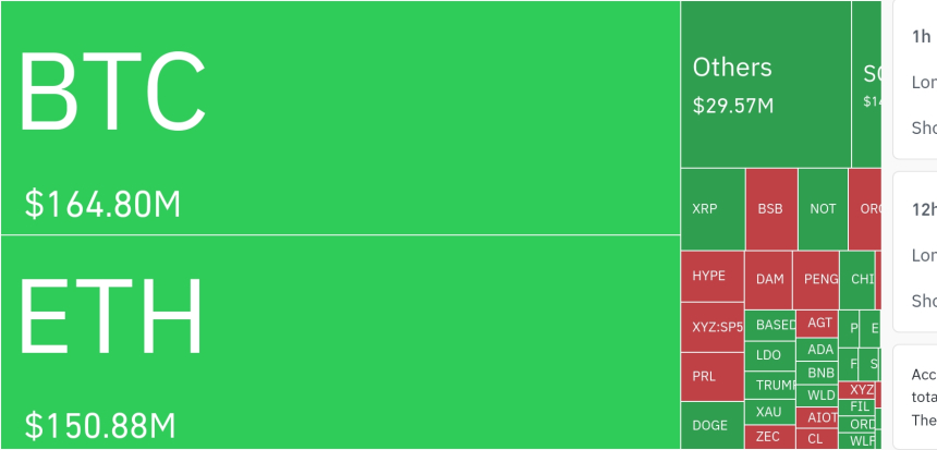 比特币相关头寸在24小时内被清算约164.8万美元,而在最近4小时内的单时段峰值达到821万美元。以太坊方面,24小时清算额约为150.88万美元,4小时内最高清算纪录为376万美元,显示出其在短期价格波动中承受较大压力。