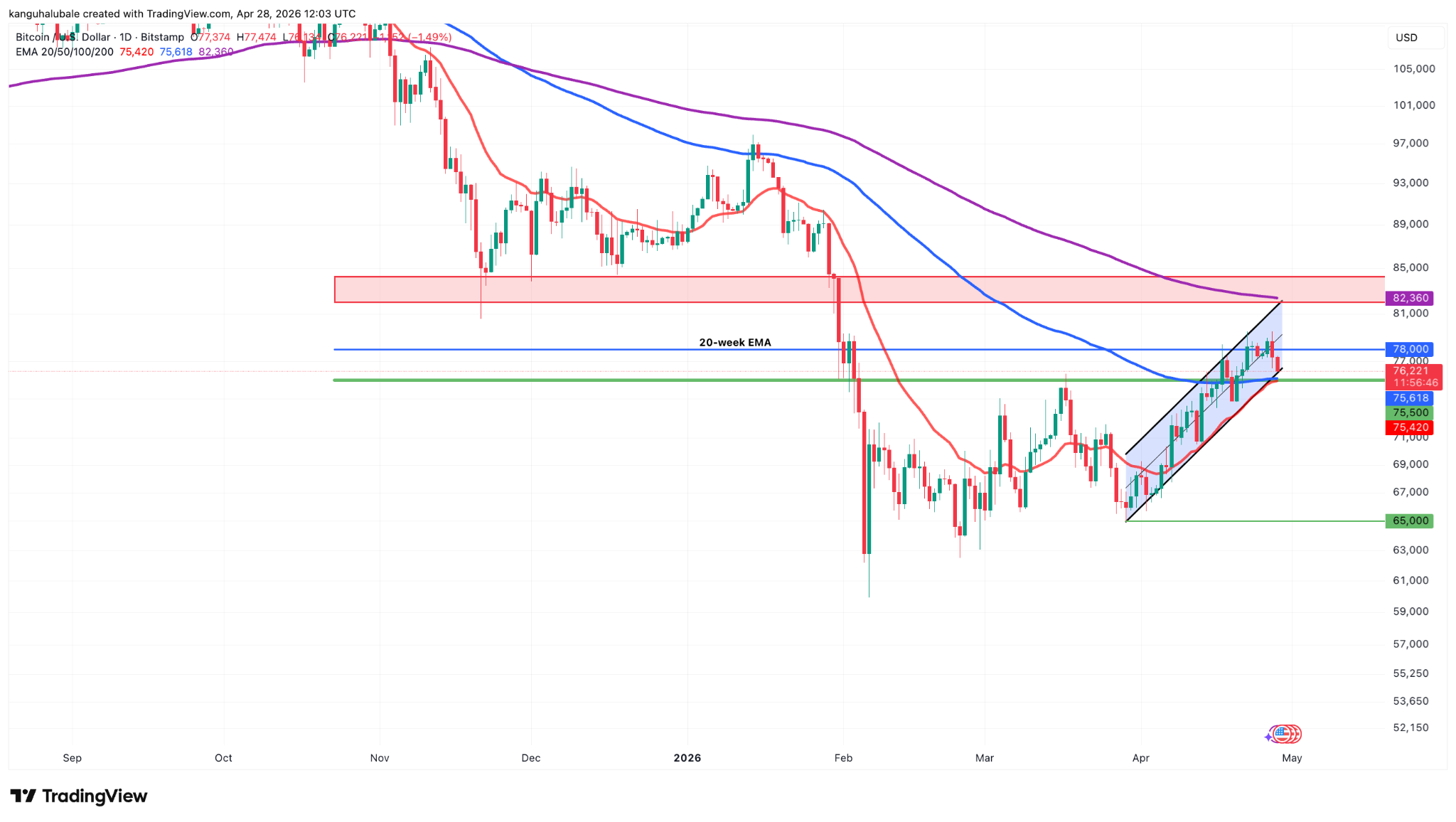 周二,比特币未能突破8万美元关口,随后回落至7.6万美元下方,受霍尔木兹海峡开放前景不明及宏观经济压力影响,市场情绪趋于谨慎。技术面与链上数据共同揭示出复苏动能存在分歧,当前价格被锁定在75,500至80,000美元的核心波动带内。