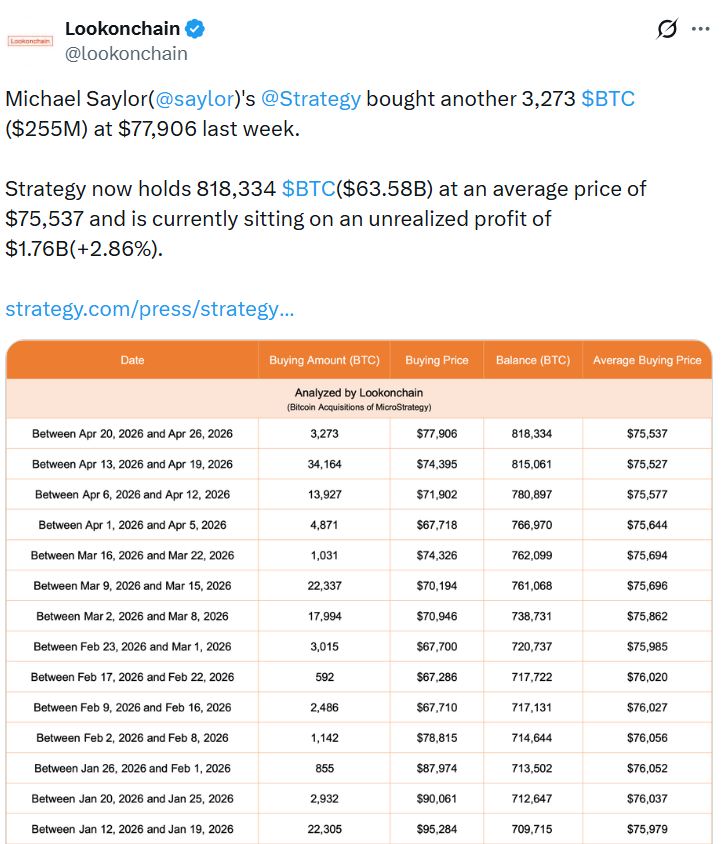 根据霍根在周二发布的报告,过去八周内,策略公司已通过公开市场收购价值72亿美元的比特币。尽管ETF资金流入与长期持有者回补构成多重支撑,但其主动购入行为始终处于最前沿。数据显示,4月20日至26日一周内,公司买入3,273枚比特币(约合2.55亿美元),总持仓量升至818,334枚BTC,位居全球上市机构首位。