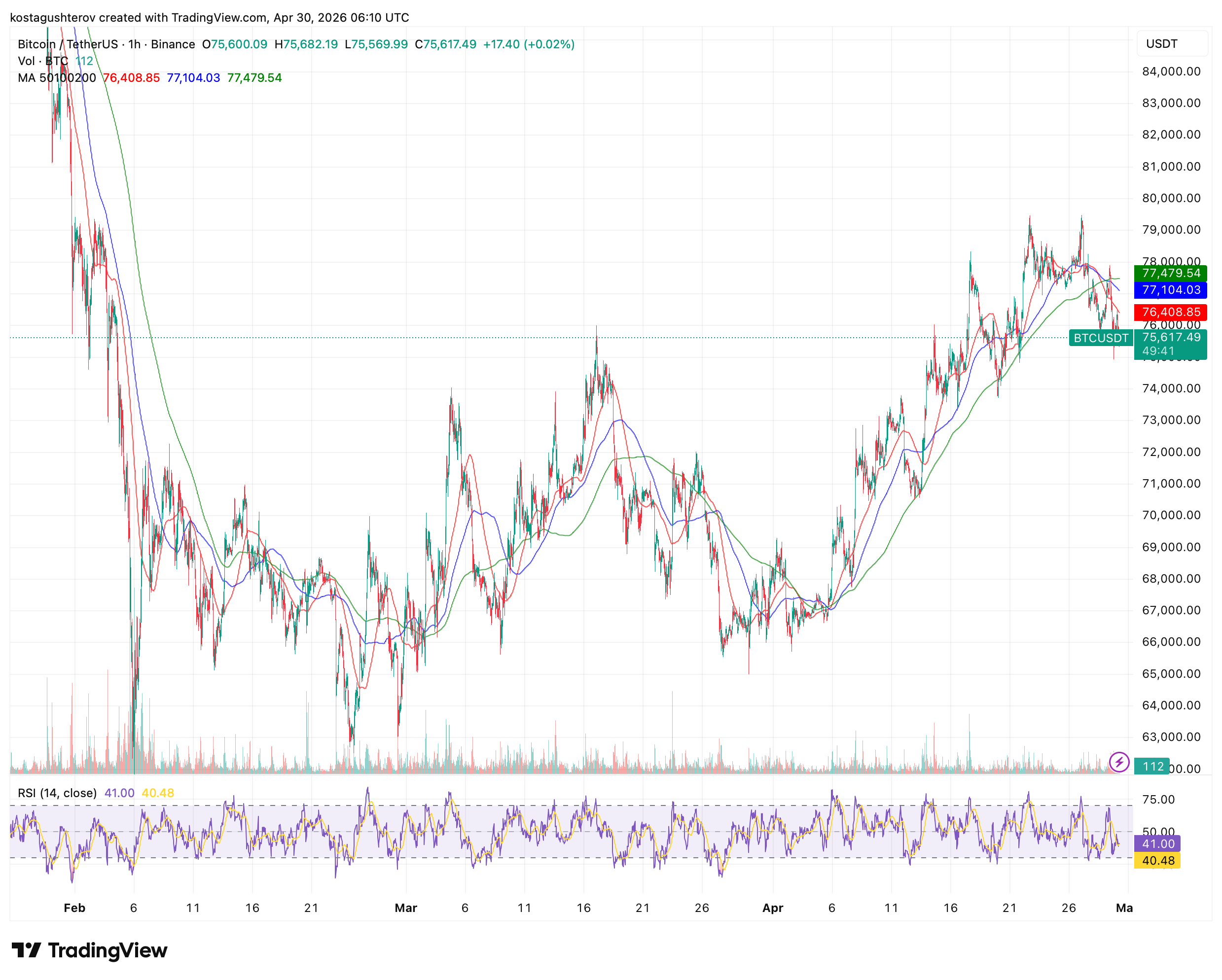 BTC在4月30日报收于75,600美元,技术指标显示动量持续衰减。快线与慢线RSI分别位于41.00与40.48,两者接近聚合,反映多时间框架下的下行压力趋于一致。