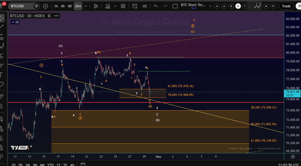 More Crypto Online分析认为,位于74,968美元的78.6%斐波那契回撤位构成当前重要心理与技术关口。图表显示,该区域已多次成为价格反应点,显示出一定支撑力。若价格能在此水平上方企稳并展开反弹,将为新一轮上行提供基础。