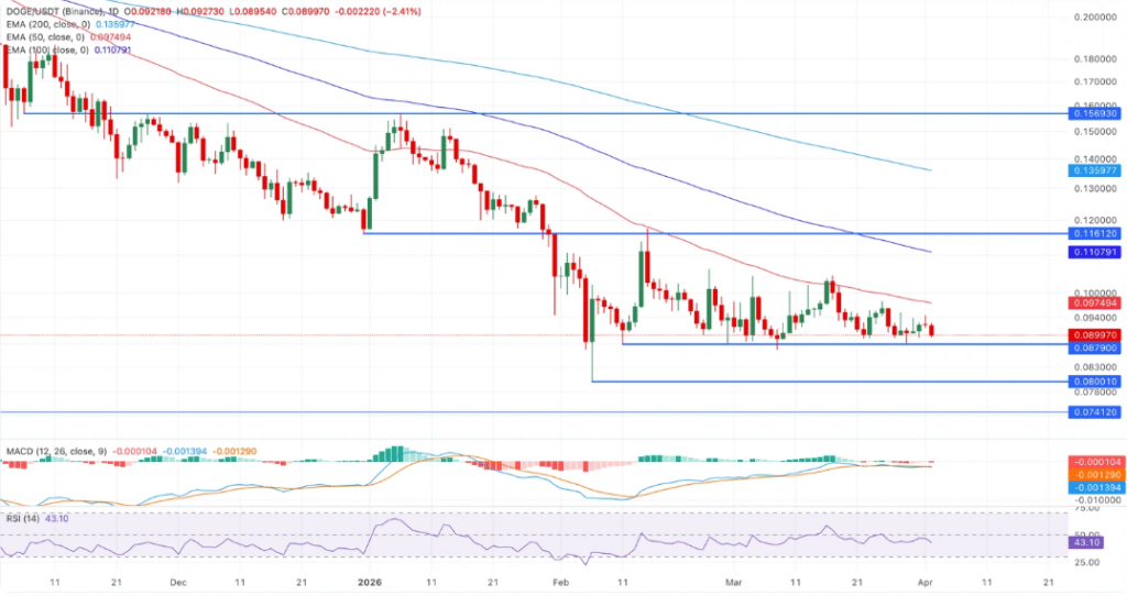 技术图形延续偏空态势。狗狗币仍位于50日指数移动平均线之下,且均线系统呈下行排列。100日与200日均线进一步确认长期看跌趋势。