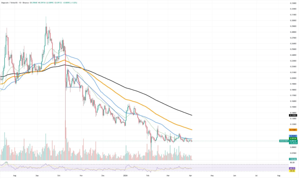 尽管看涨押注数量增加,但技术面仍显示整体结构未发生根本转变。狗狗币持续运行于关键移动平均线之下,且均线系统维持下行排列,表明下跌趋势尚未结束,仅处于初期调整阶段。