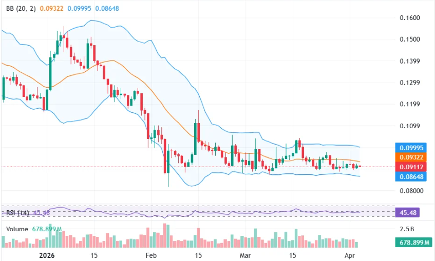 当前狗狗币正运行于重要价格区域附近,布林带通道持续收窄,显示出市场波动性减弱的特征。这一现象通常预示着即将出现方向性突破,短期内价格剧烈变动的可能性显著上升。尽管成交量走低,反映出投资者观望情绪浓厚,但若买方力量逐步恢复,卖压缓解或可推动价格向上突破。