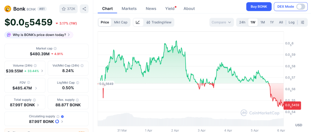 CoinMarketCap数据显示,截至2026年4月,BONK价格预测区间位于0.0000050至0.0000080美元之间,相对强弱指数(RSI)约为46,红盘日卖压仍占主导。尽管FLOKI拥有超46万质押者和5190万美元锁仓价值,但仅靠Bitkub上市难以扭转长期下行趋势。
