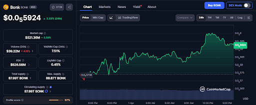 当前邦克币($BONK)报价为0.000005924美元,市值约5.2136亿美元,24小时交易额达3922万美元。价格录得3.33%涨幅,但成交量微降4.13%,显示短期买盘动能有所减弱。