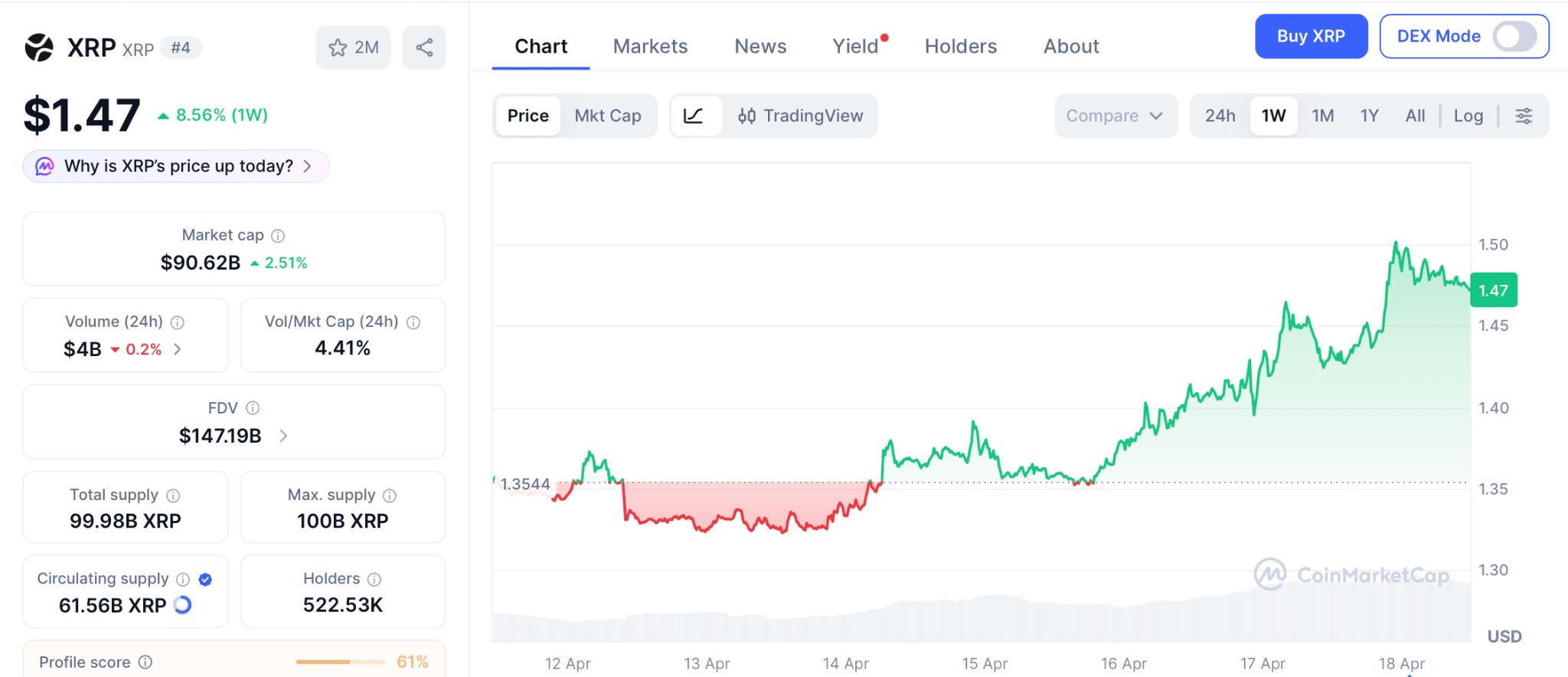 据市场分析工具显示,截至4月17日,比特币在霍尔木兹海峡恢复通航后突破78,000美元,带动整体市场情绪回暖。此时XRP报价为1.47美元,而根据CoinShares数据,其周度资金净流入已达1.196亿美元,显示出显著的资本吸引力。