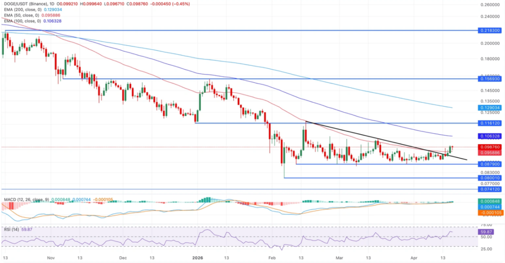 尽管整体市场情绪趋于乐观,狗狗币交易价仍略低于0.1000美元,回吐了前一阶段的部分涨幅。尽管零售投资者兴趣回升,但买方力量未能持续周四4%的反弹动能,导致价格面临短期调整压力。