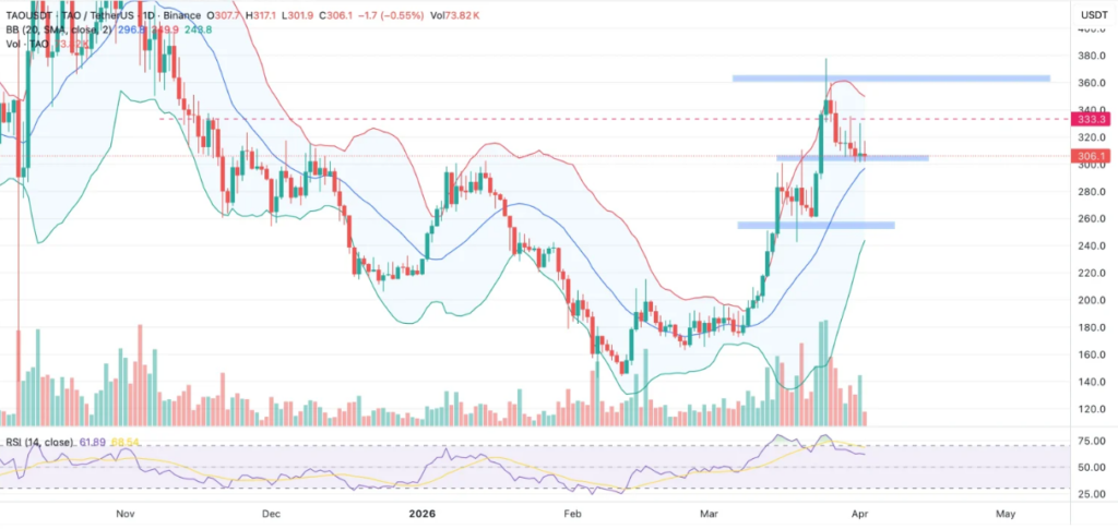 从技术图表观察,TAO整体仍处于上升通道内,高点与低点持续上移,维持典型的看涨排列。