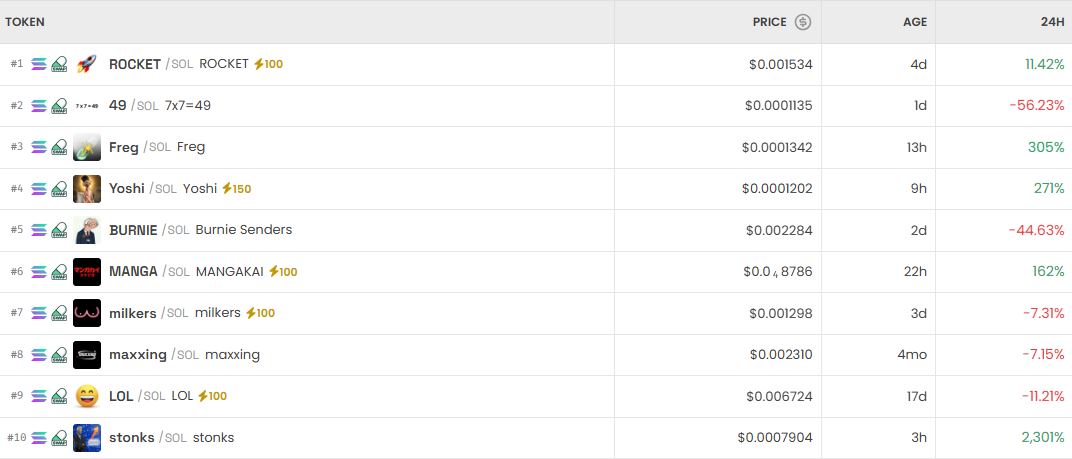 当前去中心化交易所中,ROCKET/SOL、49/SOL与Freg/SOL成为市场焦点。数据显示,ROCKET/SOL以0.001517美元报价位居趋势榜首位,24小时涨幅高达10.20%;49/SOL则报0.0001138美元,期间回调56.13%;而Freg/SOL价格为0.0001366美元,录得312%的惊人涨幅,位列第三。