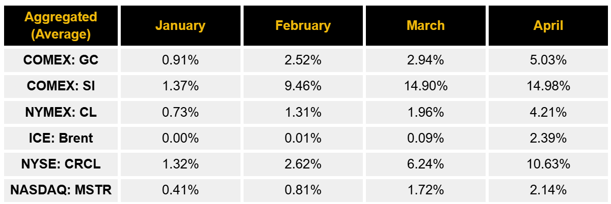 币安研究院特别指出,三月份黄金永续合约的成交量分别达到日本能源商品期货交易所的401%、印度多种商品交易所的228%以及迪拜黄金与商品交易所的216%。这一现象部分归因于周末频发的市场剧烈波动事件,使得仅在工作日开放的传统交易渠道无法满足投资者需求,从而催生了对全天候交易工具的迫切依赖。
