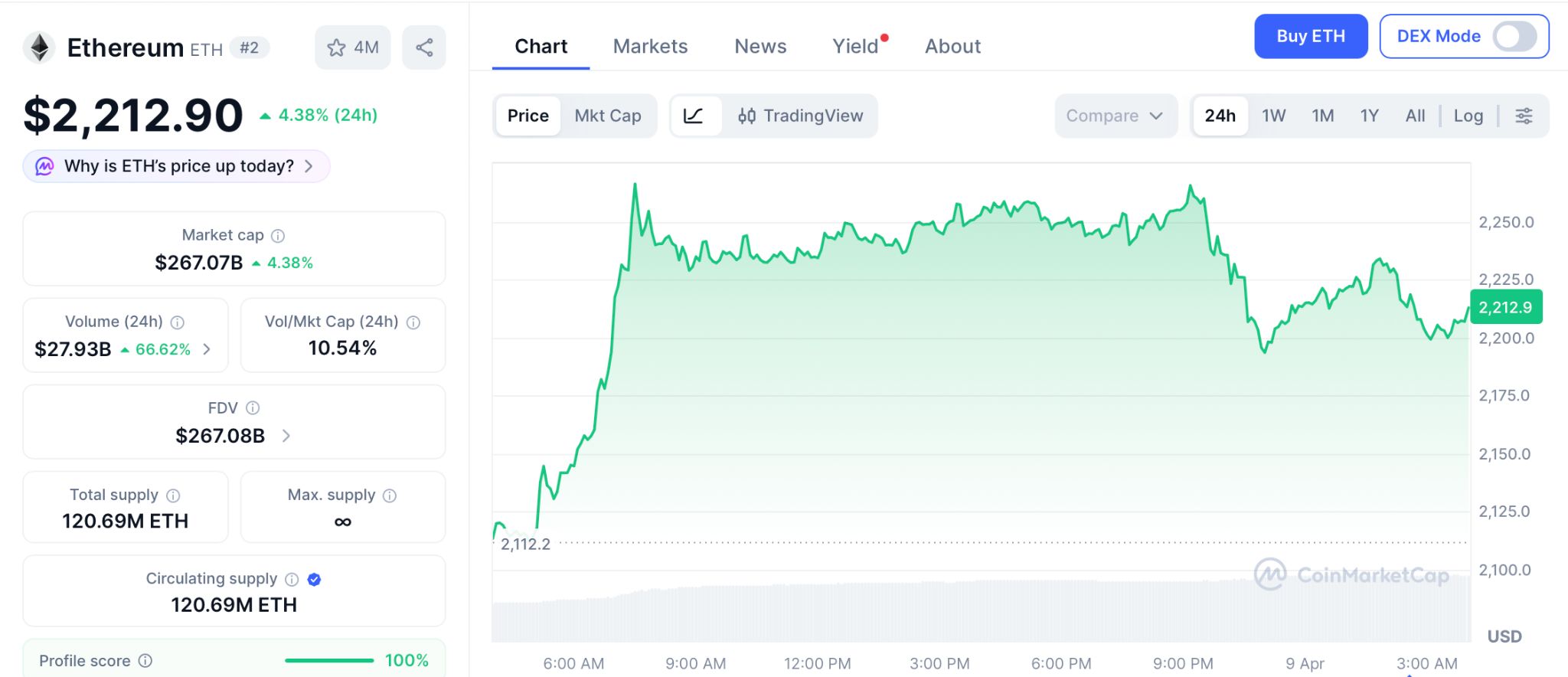 根据CoinMarketCap数据,以太坊在4月8日收于2,212美元,单日涨幅7.4%。过去十天内,巨鲸账户净增持129万枚ETH,渣打银行目标价定为7,500美元。尽管从当前价位至5,000美元需经历数月爬升,涨幅约120%,但其作为投资组合核心资产的地位不可动摇。