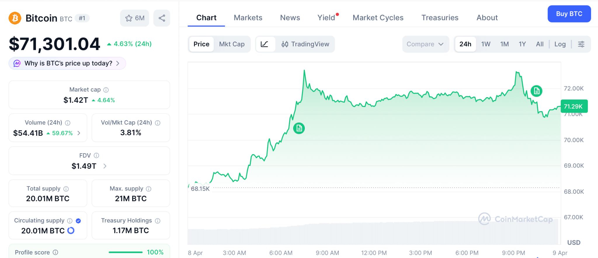 4月8日,受美伊停火缓解通胀预期影响,原油价格首次跌破100美元,推动比特币单日上涨4.63%。整个加密货币总市值重返2.52万亿美元以上,市场信心显著回升。